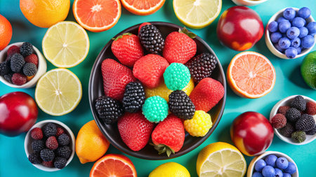 A close-up of a vibrant assortment of fresh fruits and colorful jelly candies.