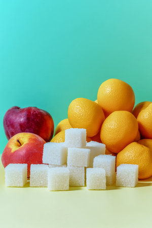 Stack of sugar cubes with different fruits on colorful background, concept of fructose harm for health, AI Generated