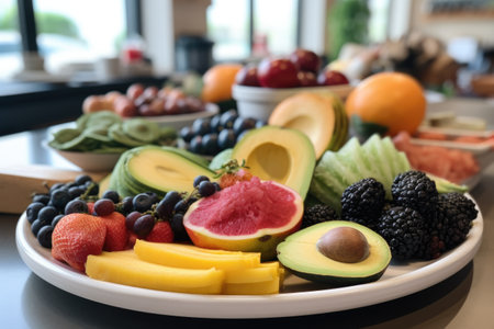 plate of fresh fruits and vegetables, with other foods in the background, created with generative ai
