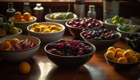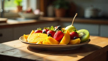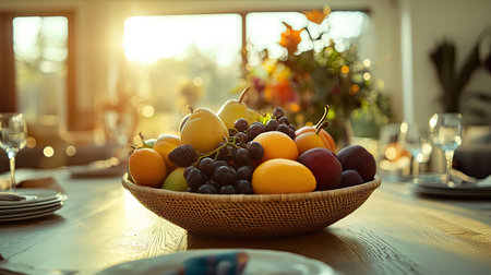 A beautifully arranged bowl of fresh fruits sits on a rustic dining table, illuminated by warm sunlight, creating a cozy and inviting atmosphere.