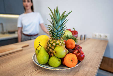 Plate with fresh fruits on the table. Healthy eating concept.