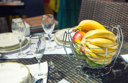 Close up table with glasses and vase for fruits