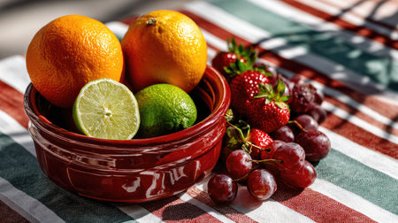 A vibrant display of fresh fruits including oranges, limes, strawberries, and grapes in a red bowl, set against a striped tablecloth.