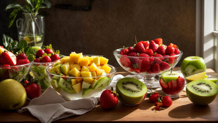 fruit salad of kiwi, apple, mango, strawberries in beautiful glass bowls, in the kitchen