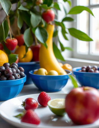 Assorted fruits and berries displayed on dishware on a table