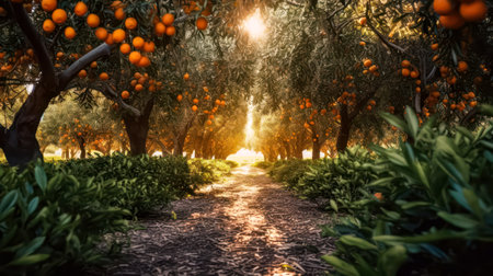 Discover a vibrant orange orchard filled with ripe fruits, lush greenery, and a tranquil pathway. This image captures the essence of agricultural beauty and seasonal abundance.