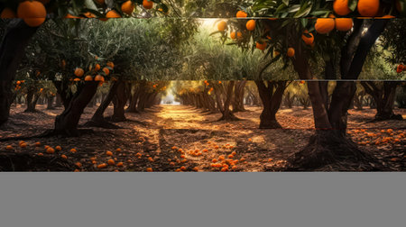 A captivating view of an orange orchard featuring ripe oranges hanging from dark green leaves, creating a lush and vibrant atmosphere.