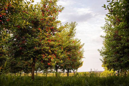 Apple orchard in autumn. Rows of apple trees with ripe red apples.