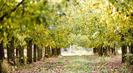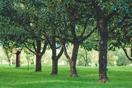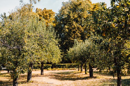A autumn orchard showcases vibrant trees with green foliage under a bright sky. Sunlight filters through the branches creating a serene atmosphere.