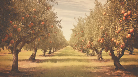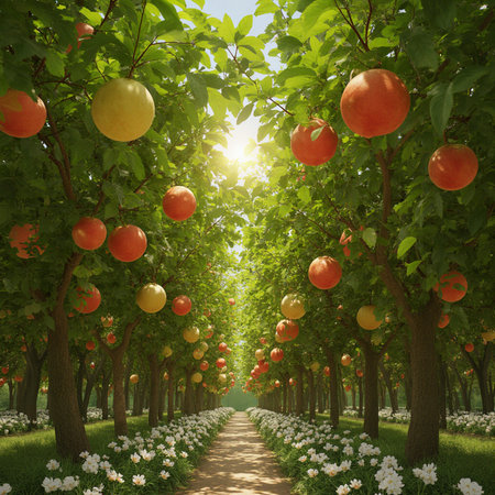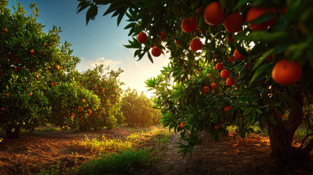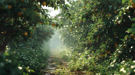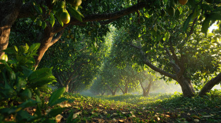 A serene orchard bathed in warm sunlight captures the beauty of nature. Lush green trees and ripe fruits create a tranquil scene perfect for agriculture enthusiasts.