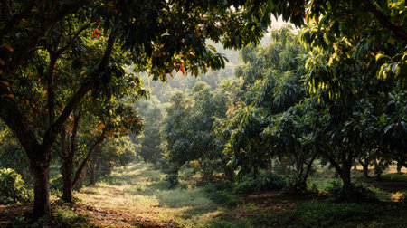 Lush tropical mango plantation features trees heavy with ripe golden mangoes, vibrant green leaves illuminated by soft natural light.
