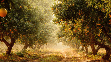 Serene view of a vibrant orange orchard, showcasing ripe fruit hanging from trees amidst a misty landscape. A peaceful pathway invites exploration.