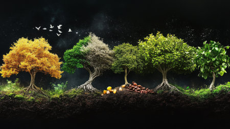A time-lapse-inspired image showing different growth stages of a tree from seed to maturity on a split-screen.