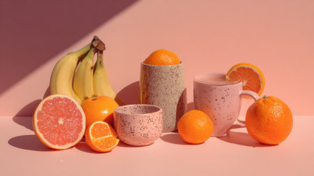 An artistic display of vibrant fresh fruits on a playful pink background, showcasing a variety of textures and colors ideal for promoting healthy eating and lifestyle.