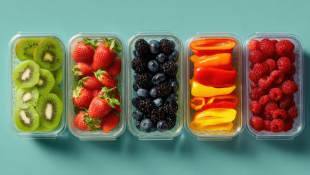 An assortment of colorful fruit is presented in clear plastic containers against a teal backdrop. The image showcases kiwi, strawberries, blackberries, bell peppers, and raspberries, each neatly organized. The composition suggests freshness and healthy eating habits, suitable for various editorial and commercial applications.