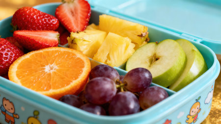 Close up view of a kid's turquoise bento box containing segregated portions of bright red strawberries, sweet citrus orange, golden pineapple chunks, and deep purple grapes.