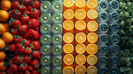 Top view of fresh fruits and jars of juices including strawberries, kiwis, oranges, blueberries, and greens neatly arranged in vibrant, colorful rows.