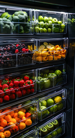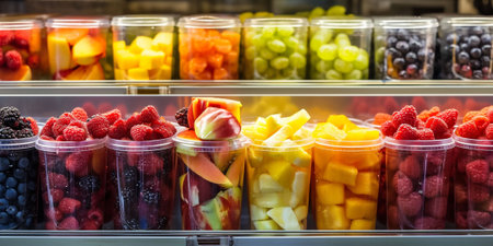 Fresh, vibrant fruits in containers form a colorful mosaic of healthy eating choices.