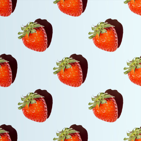 Seamless pattern of red saturated strawberries with a shadow on blue background. Summer natural sweet delicious food background. Suitable for wallpaper, textile, background, poster, greeting card