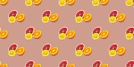Seamless pattern pink citrus fruit orange lemon lying on violet surface. Colorful fresh citrus slice wallpaper. Creative vivid vibrant color, summer friuts concept. Minimal pop art style