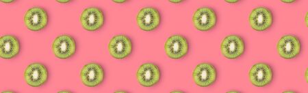 Top down view on pink abstract background with slices of ripe orange or lemon citrus in pattern - trendy minimal flat lay food summer concept