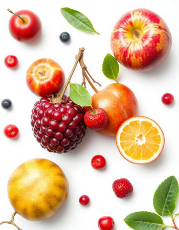 Fruits and berries isolated on white background. Flat lay, top view
