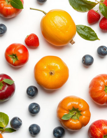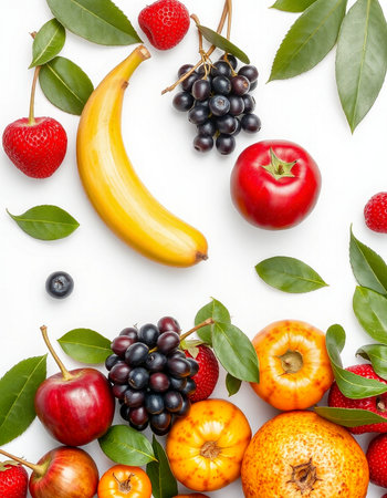 Fruits and berries on white background. Top view. Flat lay pattern