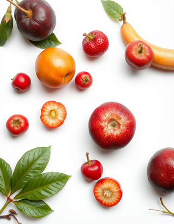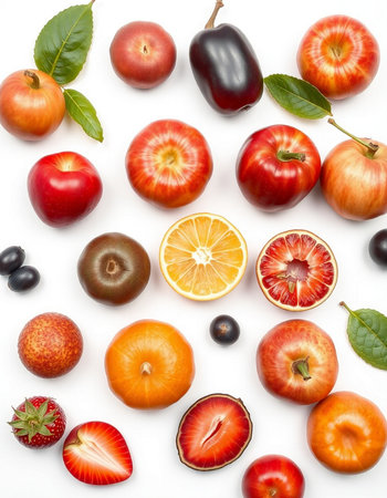 fresh fruits on white background, top view, close-up.