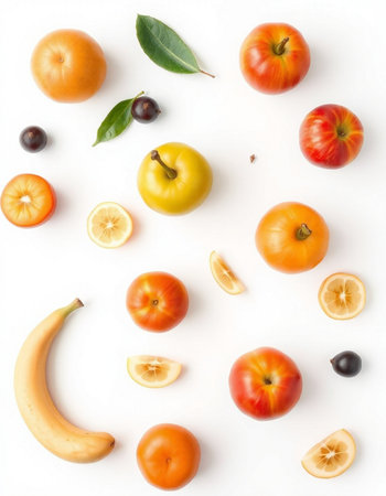 Fruits on a white background. Flat lay. Top view.