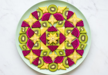 A vibrant flat lay of exotic fruit slices including kiwi, starfruit, and magenta dragon fruit, meticulously arranged in a complex geometric mandala design on a plate.
