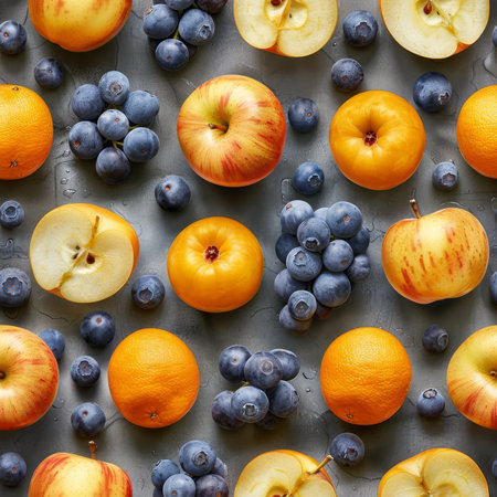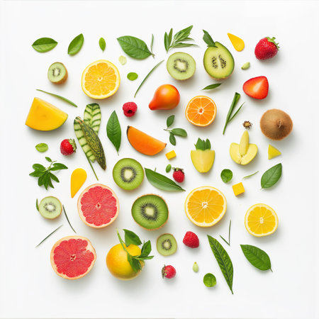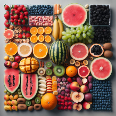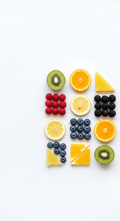 Array of vibrant fruits and berries displayed in an enticing pattern on a neutral white surface