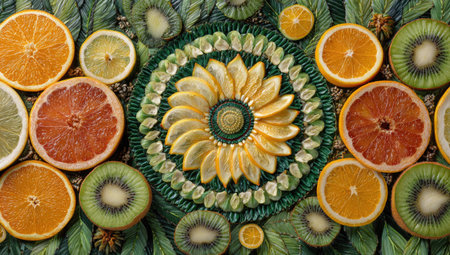 A collection of fruit slices artfully arranged to form colorful mandalas, embodying a fresh and modern yoga-inspired atmosphere