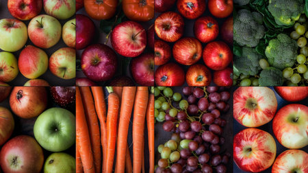 Variety showing collage of various fresh fruits and vegetables in grid format keywords: fruits, vegetables,...