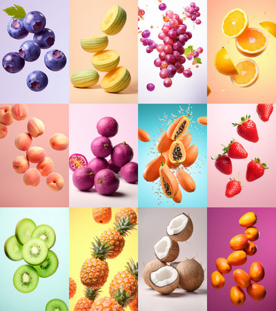 A collection of fruit images, including oranges, bananas, and grapes. Scene is bright and cheerful, with the vibrant colors of the fruit creating a sense of freshness and vitality