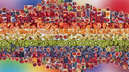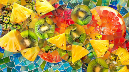 Vivid fruit mosaic: mango pineapple kiwi slices arranged in shimmering colors background
