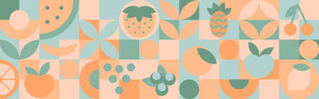 Fruits - geometric shapes, abstract minimalistic organic food banner with brutalistic shapes and simple circles and quads. Template for textiles or packaging.