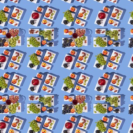 Grapes and apples on white parallelepipeds on a blue background top view, seamless pattern.