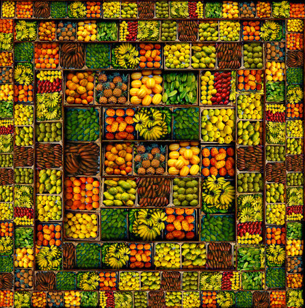 Brightly colored fruits and vegetables are arranged in a grid layout, showcasing apples, pineapples, bananas, and more in vibrant hues on a sunny day.