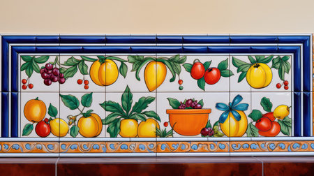 Vintage ceramic tiles featuring fruits, vegetables, and drinks with natural accents. That the image is generated using AI.