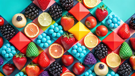 Colorful fruits and berries arranged on a geometric background.