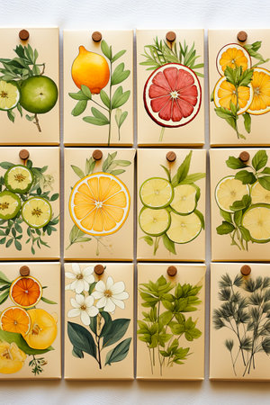 Floral and fruit decoration on tea package. commercial art