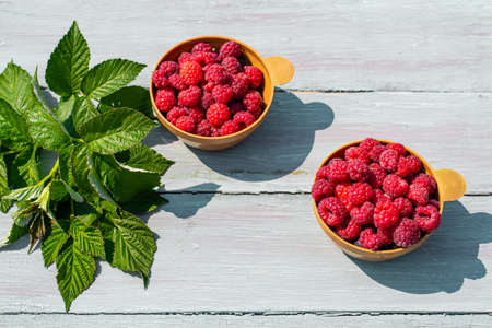 Fresh summer raspberries in a mug, collected in the garden on a light wooden background, rustic style.