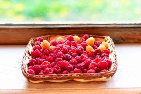 Fresh fragrant tasty red and yellow raspberries in a basket on a wooden background. Selective focus. Close-up