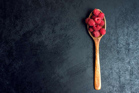 raspberries in a spoon on a dark background, concept of healthy nutrition