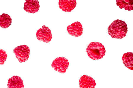 Ripe juicy fresh raspberries on white background flat lay top view. Raspberry pattern. Organic raspberries, healthy food, vitamins, summer berry fruit background. Raspberry harvest.