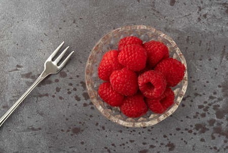Overhead view of freshly picked raspberries in a small glass bowl with a fruit fork to the side on a gray background illuminated with natural lighting.