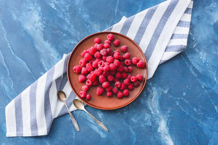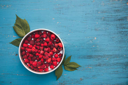 Flat lay of a bowl of red fresh raspberries on turquoise rustic wood background.