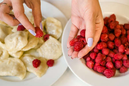 Woman hands holding fresh red raspberries on grey background. Healthy, organic food and nutrition concept. eating, dieting, vegetarian food concept