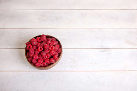 Raspberries in coconut shell bowl on white wooden background, top view copy spase