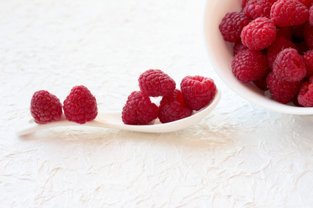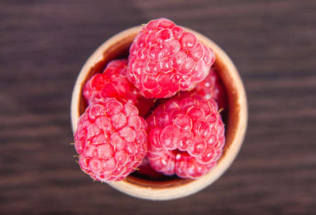 A close-up shot of a fresh raspberry in a white cup - perfect for a culinary blog diet and the benefits of natural vitamins. Healthy lifestyle. There is a place for your inscription.